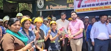 कोरिया। लोकसभा निर्वाचन का तृतीय चरण के तहत 7 मई को मतदान होना है। आज कलेक्टर व जिला निर्वाचन अधिकारी विनय कुमार लंगेह जिला पंचायत सीईओ व स्वीप कार्यक्रम के नोडल अधिकारी डॉ. आशुतोष चतुर्वेदी, चरचा माइन पहुंच कर यहां कार्यरत श्रमवीरों को 7 मई को होने वाले मतदान के लिए आमंत्रण पत्र एवं बुके प्रदान किए। इस अवसर पर बड़ी संख्या में महिला कर्मचारी, अधिकारी भी उपस्थित थीं। कलेक्टर लंगेह ने कहा कि भारतीय लोकतंत्र को और मजबूत करने के लिए सभी मतदाताओं को मतदान करना आवश्यक है। लंगेह ने बताया कि मतदान दिवस के दिन सभी मतदान केंद्रों में ठंडा पानी, छाँव, विश्राम कक्ष, शौचालय, रैम्प आदि की व्यवस्था की गई है। श्रमिकों से कहा कि मतदान सुबह 7 बजे से शाम 6 बजे तक होना है, ऐसे में आप सब समय निकालकर मतदान करने और सगे सम्बन्धियों, पड़ोसियों को भी मतदान करने के लिए प्रेरित करें।