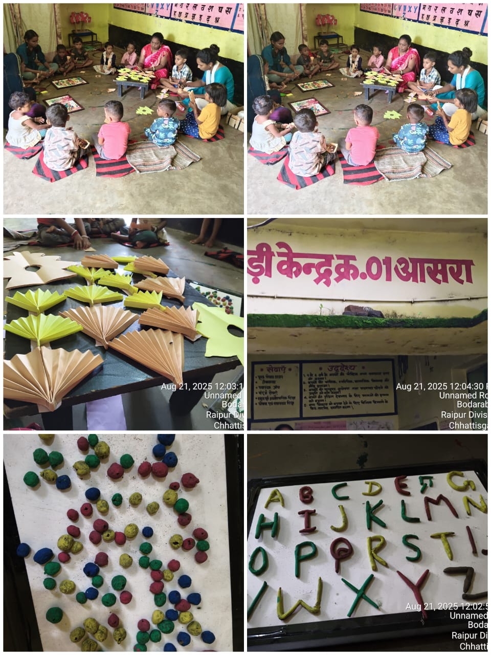 गरियाबंद 22 अगस्त 2025/ रजत जंयती वर्ष 2025 के अवसर पर महिला एवं बाल विकास विभाग द्वारा जिले में संचालित 1520 आंगनबाड़ी केन्द्रों में टॉय मेकिंग वर्कशॉप दिवस मनाया गया। जिसमें आंगनबाड़ी केन्द्र स्तर पर अनुपयोगी वस्तुओं (वेस्ट मटेरियल) का उपयोग करते हुए आंगनबाड़ी कार्यकर्ता, सहायिका, पालकों एवं देखभालकर्ताओं, दादा-दादी स्थानीय शिल्पियों द्वारा साथ में मिलकर खिलौने/शिक्षण सामग्री, रंगीन काजग का खिलौना, बांस/लकड़ी सेे खिलौना, वेस्ट साड़ी से पैरदान, माचिस के डिब्बे से रेलगाड़ी, बिस्लरी बॉटल से झुमर, चिड़िया, गुलदस्ता, कॉच के बॉटल में पानी के साथ कलरभर खिलौना आदि बनाया गया। जिसका उपयोग आंगनबाड़ी केन्द्र में गतिविधि आयोजन के लिए किया जा सके। प्रति बच्चा वेस्ट मटेरियल से 01 खिलौना बनाया गया। 03 से 06 वर्ष के बच्चों के पालकों को घर से टॉय बनाकर लाने के लिए प्रोत्साहित किया गया। इसके साथ गांव में खिलौने दान करने का अभियान चलाया गया। इससे आंगनबाड़ी केन्द्रों में खिलौने की मात्रा बढ़ जायेगी। जिससे आंगनबाड़ी से लाभान्वित बच्चों को खिलौनों की पूर्ति हो जाएगी। इस कार्यक्रम में सबसे अच्छे टॉय बनाकर लाने वाले बच्चों/पालकों को प्रथम, द्वितीय एवं तृतीय पुरूस्कार दिया गया।