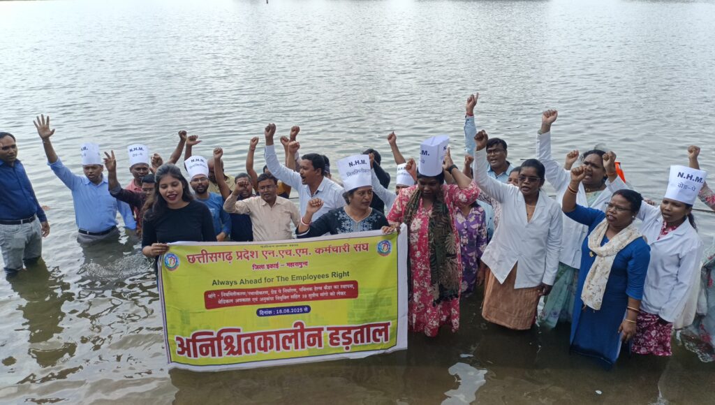 महासमुंद। जिले के एनएचएम स्वास्थ्य कर्मचारियों ने अनिश्चितकालीन हड़ताल के 19वें दिन आज खरोरा तालाब में जल सत्याग्रह कर अपना विरोध प्रदर्शन किया। हड़ताल के दौरान अलग-अलग तरीकों से अपना विरोध दर्ज कराते हुए शासन-प्रशासन का ध्यान आकर्षित कराया जा रहा है। संघ के जिला अध्यक्ष रामगोपाल खुंटे ने बताया कि एन एच एम स्वास्थ्य कर्मी 18 अगस्त से जिला मुख्यालय में नियमितीकरण, ग्रेड पे समेत दस सूत्रीय मांगों को लेकर अनिश्चितकालीन हड़ताल पर हैं। सरकार को जगाने अलग-अलग गतिविधियों से प्रदर्शन कर रहे हैं। लेकिन उसका कोई असर सरकार पर नहीं पड़ रहा है। उल्टे, सरकार हमारी एकता को तोड़ने के लिए गुरूवार को हमारे 125 पदाधिकारियों को बर्खास्तगी का पत्र जारी कर कर्मचारियों के बीच आक्रोश पैदा कर दिया। सरकार के इस फैसले के बाद प्रदेश के 16 हजार व जिले के 550 एन एच एम कर्मचारियों ने एक साथ सामूहिक इस्तीफा दिया है। हम सरकार के सामने झुकने वाले नहीं हैं, हमारा आंदोलन जारी रहेगा। आज विरोध स्वरूप खरोरा तालाब में जल सत्याग्रह चल रहा है। इससे पूर्व शहीद स्मारक के पास सभी ने एकमत होकर संकल्प लिया कि जब तक सरकार हमारी मांगें नहीं मानती है तब तक अनिश्चितकालीन हड़ताल जारी रहेगी।