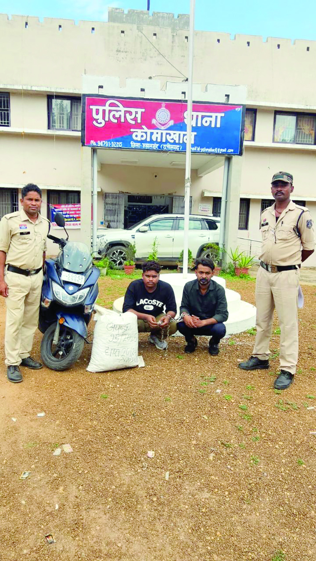 महासमुंद। कोमाखान पुलिस ने गांजे का परिवहन कर रहे दो लोगों को गिरफ्तार किया है। मामले में आरोपियों के विरूद्ध एनडीपीएस एक्ट के तहत जुर्म दर्ज किया गया है। पुलिस ने बताया कि मोटर व्हीकल एक्ट के तहत जांच नाका नर्रा पहुंचकर कार्रवाई की जा रही थी। इसी दौरान मुखबिर से सूचना पर स्कूटी सवारों से संदेह के आधार पर पूछताछ की गई। जिसने अपना नाम-पता सिनापाली थाना नुवापाडा जिला नुवापाडा ओडिसा हाल पता भांठागांव रावतपुरा फेस नंबर 01 थाना टिकरापारा जिला रायपुर निवासी रमेश बाघ (20) व स्कूटी के पीछे बैठे व्यक्ति ने अपना नाम-पता वार्ड 34 जगन्नाथ नगर पंडरी थाना सिविल लाईन रायपुर जिला रायपुर निवासी देवेंद्र जगत (30) बताया। स्कूटी में गांजा रखना बताया।