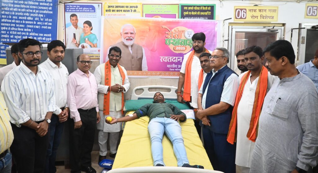 जिला अस्पताल में आयोजित रक्तदान शिविर में बड़ी संख्या में रक्तदाताओं ने उत्साहपूर्वक भाग लिया। कई युवाओं ने पहली बार रक्तदान कर समाज सेवा का संकल्प लिया। शिविर में जिला अस्पताल के चिकित्सकों और स्वास्थ्यकर्मियों की टीम सक्रिय रूप से मौजूद रही। इस अवसर पर शिविर के दौरान वातावरण में उत्साह और सेवा भाव का संचार दिखाई दिया। इस कार्यक्रम में जिला पंचायत उपाध्यक्ष श्रीमती लालिमा ठाकुर, जिला पंचायत सदस्य श्रीमती शिवांगी चतुर्वेदी, पूर्व विधायक संतोष उपाध्याय, डमरूधर पुजारी, वरिष्ठ नागरिक अनिल चंद्राकर, चंद्रशेखर साहू, आशीष शर्मा, सीएमएचओ डॉ. यू एस नवरत्न, सिविल सर्जन डॉ. वाय के ध्रुव, डीपीएम गणपत नायक सहित जिला अस्पताल के अधिकारी-कर्मचारी, स्वयंसेवकगण एवं बड़ी संख्या में नागरिकगण मौजूद रहे।