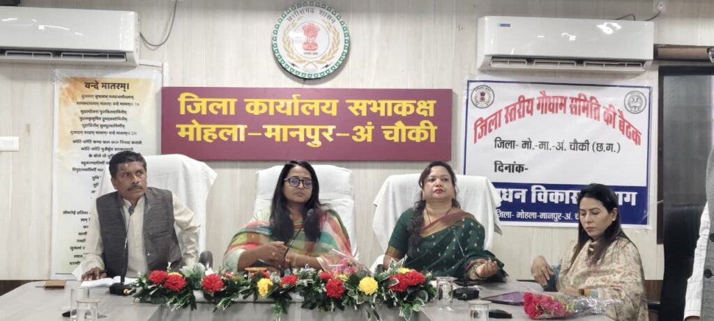 मोहला 17 दिसंबर 2025। छत्तीसगढ़ गौ सेवा आयोग के निर्देशानुसार आज कलेक्टोरेट सभाकक्ष में जिला स्तरीय एवं विकासखंड स्तरीय गौधाम समिति के अध्यक्षों एवं सदस्यों की उपस्थिति में गौधाम योजना की समीक्षा बैठक आयोजित की गई। बैठक में जिला पंचायत अध्यक्ष श्रीमती नम्रता सिंह, कलेक्टर श्रीमती तूलिका प्रजापति, जिला स्तरीय गौ सेवा समिति अध्यक्ष चिंता राम नायक तथा मुख्य कार्यपालन अधिकारी जिला पंचायत श्रीमती भारती चंद्राकर उपस्थित रहीं।