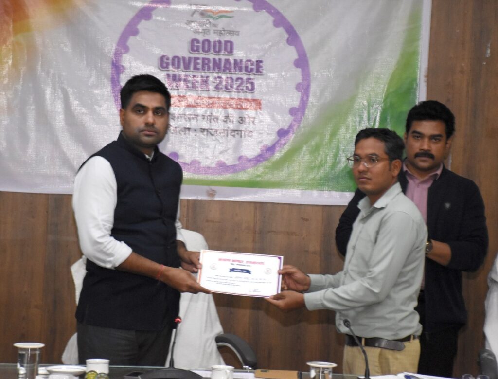 राजनांदगांव 20 दिसम्बर 2025। कलेक्टर जितेन्द्र यादव ने आज कलेक्टोरेट सभाकक्ष में धान खरीदी कार्य में उत्कृष्ट प्रदर्शन करने वाले ग्रामीण कृषि विस्तार अधिकारियों, पटवारियों, समिति प्रबंधकों एवं डाटा एण्ट्री ऑपरेटरों को प्रशस्ति पत्र प्रदान कर सम्मानित किया। कलेक्टर ने ग्रामीण कृषि विस्तार अधिकारी छुरिया सुश्री दीक्षा नंदेश्वर, ग्रामीण कृषि विस्तार अधिकारी सीतागोटा डिम्पल खापर्डे, ग्रामीण कृषि विस्तार अधिकारी कोकपुर शैलेश साहू, पटवारी छुरिया प्रशांत सिंह ठाकुर, पटवारी घोघरे आशीष साहू, पटवारी बम्हनी चारभाटा सोनम कोकिला, पटवारी घुपसाल डेविड भूआर्य, पटवारी राहुल कसेट, पटवारी हुकुम चंद महिलांग, समिति प्रबंधक जोब धनसिंग, समिति प्रबंधक गहिराभेड़ी बसंत, समिति प्रबंधक कुमर्दा मनकलाल साहू, डाटा एण्ट्री ऑपरेटर धान उपार्जन केन्द्र बोरतालाव भागचंद साहू, डाटा एण्ट्री ऑपरेटर धान उपार्जन केन्द्र गहिराभेंडी रिमन्त कुमार साहू, डाटा एण्ट्री ऑपरेटर धान उपार्जन केन्द्र जोब विनोद साहू को प्रशस्ति पत्र प्रदान कर सम्मानित किया।