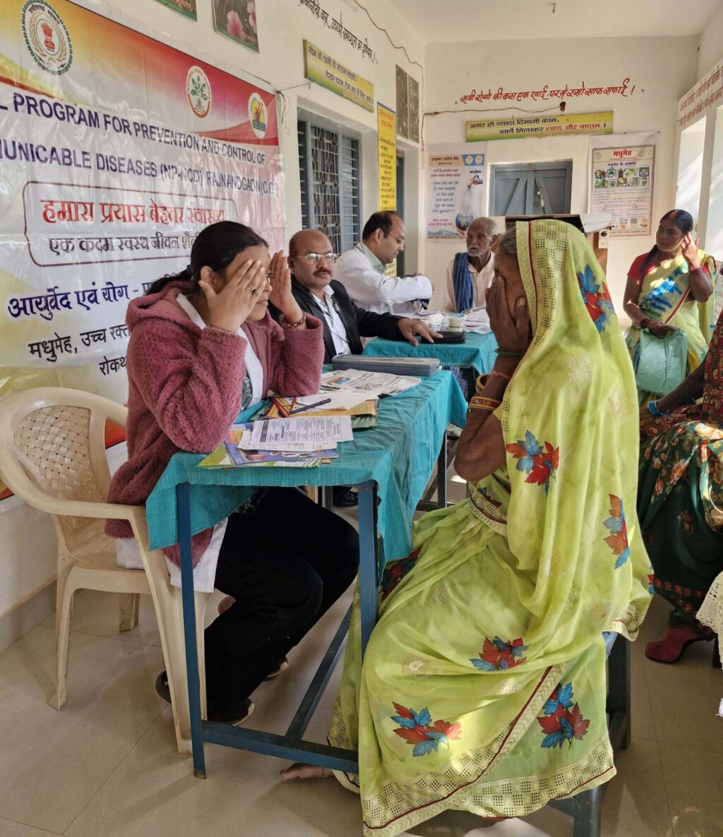 राजनांदगांव 31 दिसम्बर 2025।राष्ट्रीय आयुष मिशन अंतर्गत संचालित एनपीसीडीसीएस कार्यक्रम के तहत आयुष विभाग द्वारा आयुष्मान आरोग्य मंदिर बघेरा में नि:शुल्क चिकित्सा एवं जनजागरूकता शिविर का आयोजन किया गया। शिविर में कुल 31 ग्रामीणों का स्वास्थ्य परीक्षण किया गया, जिनमें 25 ग्रामीणों की उच्च रक्तचाप एवं मधुमेह की जांच की गई। परीक्षण उपरांत रोगियों को संतुलित आहार-विहार अपनाने की सलाह दी गई तथा आवश्यकतानुसार औषधियों का नि:शुल्क वितरण किया गया शिविर में ग्रामीणों को गैर-संक्रामक रोगों के कारण, उनके लक्षण एवं बचाव के उपायों के संबंध में विस्तृत जानकारी दी गई। साथ ही नियमित योग, प्राणायाम, दिनचर्या एवं ऋतुचर्या के पालन से होने वाले स्वास्थ्य लाभों के बारे में भी जागरूक किया गया। योग चिकित्सक द्वारा विभिन्न योगाभ्यास एवं प्राणायाम का व्यावहारिक प्रशिक्षण भी प्रदान किया गया। शिविर में सरपंच श्रीमती ऐश्वर्या देशमुख, आयुर्वेद चिकित्साधिकारी डॉ. सुरेन्द्र मेश्राम, आयुष चिकित्सक डॉ. अनमोल गुप्ता, योग चिकित्सक डॉ. स्नेहा देशमुख, पीटीएस जैतराम यादव, योग प्रशिक्षक मनीष लहरे सहित बड़ी संख्या में ग्रामीण उपस्थित रहे।