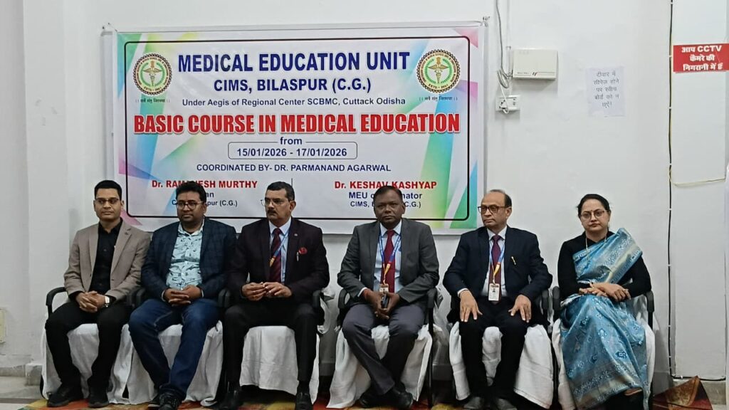 बिलासपुर, 16 जनवरी 2026/छत्तीसगढ़ आयुर्विज्ञान संस्थान (सिम्स), बिलासपुर में अधिष्ठाता (डीन) डॉ. रमणेश मूर्ति के कुशल नेतृत्व एवं मार्गदर्शन में आयोजित तीन दिवसीय राष्ट्रीय स्तरीय कार्यशाला के माध्यम से चिकित्सा शिक्षा के क्षेत्र में नवाचारों को साझा किया जा रहा है। राष्ट्रीय आयुर्विज्ञान आयोग की ओर से आए समन्वयक डॉ. परमानंद अग्रवाल की देखरेख में आयोजित इस कार्यक्रम में तीन मेडिकल कॉलेजों के फैकल्टी सदस्य हिस्सा ले रहे हैं।