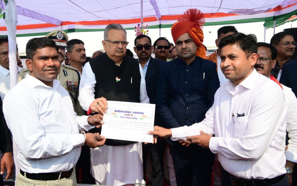 राजनांदगांव 26 जनवरी 2026। गणतंत्र दिवस के अवसर पर दिग्विजय स्टेडियम राजनांदगांव में आयोजित जिला स्तरीय मुख्य समारोह में मुख्य अतिथि विधानसभा अध्यक्ष डॉ. रमन सिंह ने उत्कृष्ट कार्य के लिए जनसंपर्क विभाग के सहायक सूचना अधिकारी प्रवीण रंगारी एवं भृत्य भूपेन्द्र साहू को प्रतीक चिन्ह एवं प्रशस्ति पत्र प्रदान कर सम्मानित किया। उल्लेखनीय है कि जनसंपर्क विभाग के सहायक सूचना अधिकारी प्रवीण रंगारी को शासन की योजनाओं का प्रचार-प्रसार एवं समाचार कव्हरेज सहित अन्य उत्कृष्ट कार्य के लिए सम्मानित किया गया। इस तरह जनसंपर्क विभाग के भृत्य भूपेन्द्र साहू को कार्यालयीन कार्य में तत्परता एवं सक्रियता से कार्य करने के लिए सम्मानित किया गया।