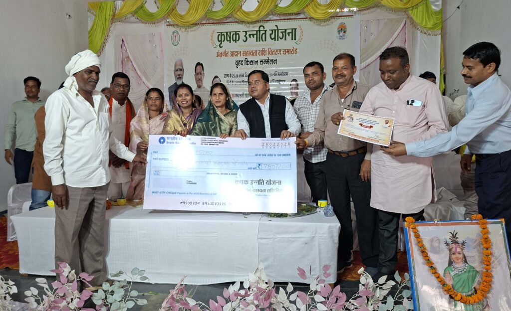 राजनांदगांव 28 फरवरी 2026। कृषक उन्नति योजना अंतर्गत आदान सहायता राशि वितरण एवं वृहद किसान सम्मेलन कार्यक्रम के तहत छुरिया विकासखंड के सामुदायिक भवन जनपद पंचायत छुरिया में विकासखंड स्तरीय कृषक कार्यक्रम का आयोजन किया गया। कृषक उन्नति योजना अंतर्गत छुरिया विकासखंड के 34392 कृषकों के बैंक खाते में 119.8779 करोड़ रूपए की राशि का भुगतान किया गया। कार्यक्रम में खरीफ वर्ष 2025 में समिति में धान विक्रय करने वाले अधिकतम एवं न्यूनतम रकबा वाले कृषकों तथा ग्रीष्मकालीन धान के बदले अन्य फसल लेने वाले कृषकों और उन्नतशील कृषकों को शॉल-श्रीफल व प्रमाण पत्र प्रदान कर सम्मानित किया गया। कार्यक्रम में ग्राम जोशिलमती के कृषक यादव राम साहू ने प्राकृतिक खेती के संबंध में अपने अनुभव साझा किया और उपस्थित कृषकों को प्राकृतिक खेती को अपनाने के लिए प्रेरित किया। ग्राम केशाल के कृषक उमाशंकर चंद्रवंशी ने जैविक खेती के संबंध में अपना अनुभव साझा किया। साथ ही कृषक उन्नति योजना अंतर्गत ग्राम बापूटोला के कृषक कलीराम धनकर को 785720 रूपए का चेक प्रदान किया गया।
