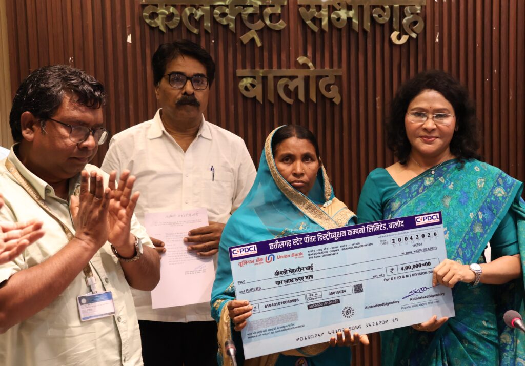 बालोद, 20 अप्रैल 2026/कलेक्टर श्रीमती दिव्या उमेश मिश्रा ने आज कलेक्टर जनदर्शन कार्यक्रम के दौरान विद्युत दुर्घटना के कारण मृत हो जाने वाले 02 व्यक्तियों के परिजनों को 04-04 लाख रूपये की आर्थिक सहायता राशि प्रदान की। इसके अंतर्गत उन्होंने डौण्डी विकासखण्ड के ग्राम ठेमाबुजुर्ग निवासी हेमलाल चुरेन्द्र के विद्युत दुर्घटना में मृत्यु हो जाने पर उनकी धर्मपत्नी श्रीमती ओमाबाई चुरेन्द्र को एवं रायपुरा निवासी समारू राम के विद्युत दुर्घटना में मृत होने पर उनकी धर्मपत्नी श्रीमती मेहतरीन बाई को 04-04 लाख रूपये का आर्थिक सहायता राशि प्रदान की। उल्लेखनीय है कि छत्तीसगढ़ विद्युत वितरण कंपनी लिमिटेड द्वारा उक्त दोनों व्यक्तियों के विद्युत दुर्घटना में मृत्यु हो जाने पर उनके उत्तराधिकारियों के लिए 04-04 लाख रूपये की राशि स्वीकृत की गई है। इस दौरान जिला पंचायत के मुख्य कार्यपालन अधिकारी सुनील चंद्रवंशी, अपर कलेक्टर चंद्रकांत कौशिक, नूतन कंवर एवं अजय किशोर लकरा सहित छत्तीसगढ़ विद्युत वितरण कंपनी के कार्यपालन अभियंता एसके बंड सहित अन्य अधिकारीगण उपस्थित थे।