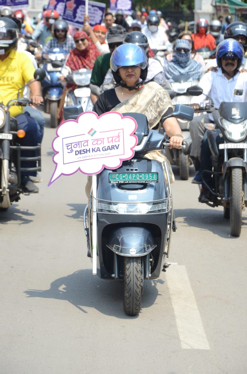 बाइक रैली कलेक्ट्रेट परिसर से आकाशवाणी चौक होते हुए व्हाइट हाउस, श्याम टॉकीज, लिली चौक, पुरानी बस्ती विवेकानन्द आश्रम, एनआईटी कैम्पस, नालन्दा परिसर में समाप्त हुई। रैली का नेतृत्व श्रीमती रीना बाबा साहेब कंगाले तथा कलेक्टर एवं जिला निर्वाचन अधिकारी डॉ. गौरव सिंह ने किया। श्रीमती कंगाले स्वंय हेलमेट पहने हुए ई-स्कूटर आई क्यूब पर सवार थी, जिसमें चुनाव का पर्व, देश का पर्व की तख्ती लगी हुई थी। कलेक्टर डॉ. गौरव सिंह हेलमेट पहने हुए बुलेट पर सवार थे उनके पीछे नगर निगम आयुक्त अबिनाश मिश्रा बैठे थे। नालंदा परिसर में समाप्त होने के पश्चात् छोटा कार्यक्रम का आयोजन हुआ, जिसमें एआईजी संजय शर्मा और उनकी टीम के द्वारा मतदाता जागरूकता पर आधारित जुम्बा प्रस्तुत किया गया। साथ ही तेजराम साहू ने लोक नृत्य प्रस्तुत करते हुए मतदाताओं से वोट डालने की अपील की। इस अवसर पर श्रीमती कंगाले ने मतदान करने की शपथ दिलायी। इस अवसर पर जुम्बा एवं लोक कलापथक दल के कलाकारों को स्वामी विवेकानंद के विचारों पर आधारित पुस्तकें भेंट की गई।